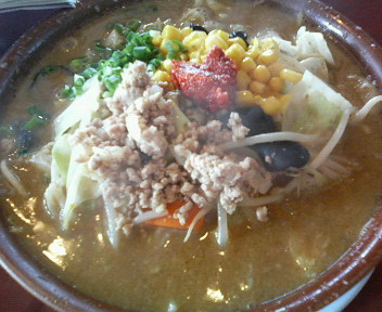 炒めた野菜にコーン、挽肉がたっぷりで見るからにボリューム満点。真ん中に辛味噌が乗っている。 普通の味噌に入っていたワカメ、チャーシューは見当たらない。 スープは背脂入りのコッテリしたものだが、野菜の甘みがあって、クドさは感じない。