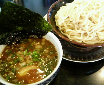 カレーっぽい色のつけ汁は魚粉濃厚タイプ。ただ、鶏油とネギのシャキシャキ感がちょっと新しい。